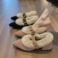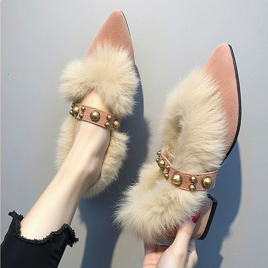 仙女風毛絨高跟鞋 毛絨圍邊暖乎乎 尖頭顯腿長 金屬鉚釘添精緻 溫柔又時髦 出行自帶柔美感