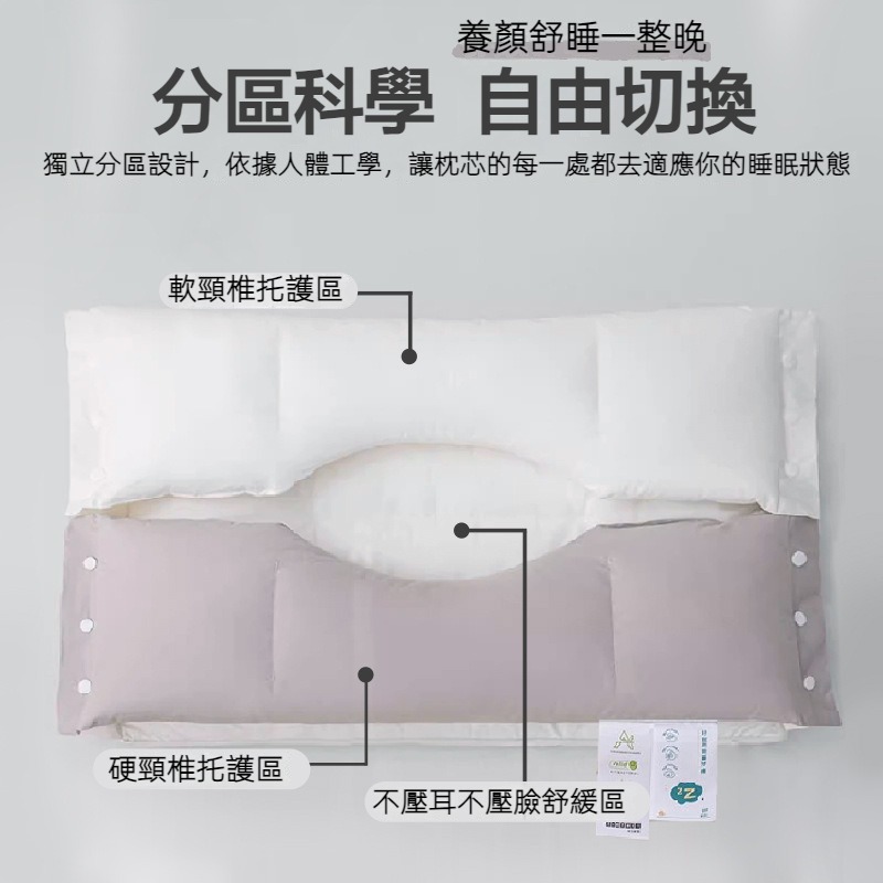【睡覺脖子再也不落空!!】 雙向護頸熟睡枕!一枕雙高度!側睡仰睡趴睡都舒服!一枕3高度,解放所有睡姿!!雙倍填充,久睡也不塌!枕頭可分拆,機洗好簡單!!枕頭軟硬分區,貼合頸椎與頭部!!分區支撐,護頸一夜好睡!!